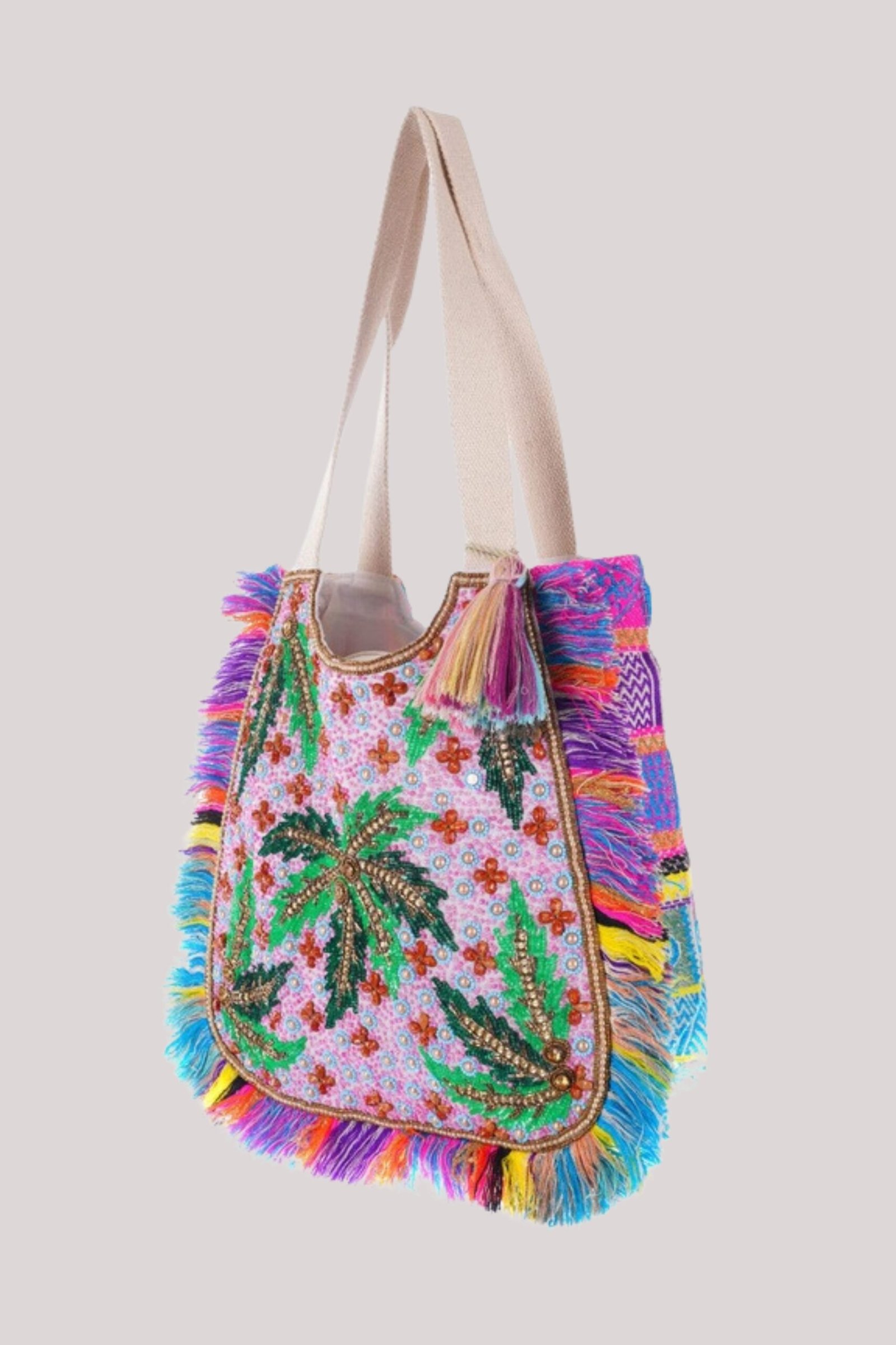 Description: Acrylic cotton tote featuring colorful fringe, beadwork, palm tree motifs, and playful tassel.